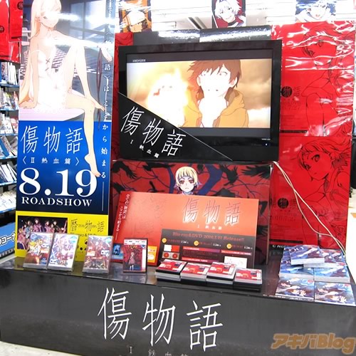 剧场动画「伤物语 I 铁血篇(傷物語 I 鉄血篇)」BD完全生产限定版/通常版【AA】于7月26日发售。收录了本篇、PV・CM集、西尾維新新写的人物评论,姬丝秀忒(キスショット)&忍野咩咩(忍野メメ),海报宣传语『欢迎来到,夜之世界』。Atre(アトレ)秋叶原和物语系列的合作活动也开始举办。