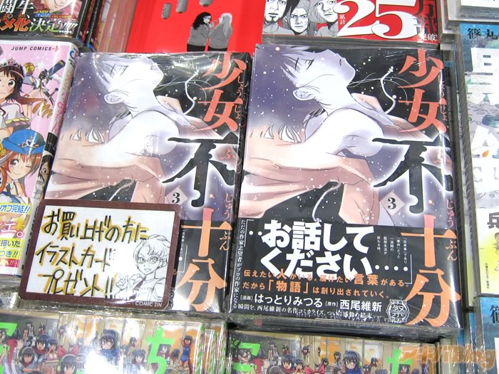 西尾維新的小说,はっとりみつる作画的漫画版「少女不十分」最终第3卷【AA】于10月6日发售。封带宣传语『因某个「事件」而开始的一周监监禁生活结束之时』,漫画的情报为『不十分的少女和青年的1周间。终于感动的完结』。