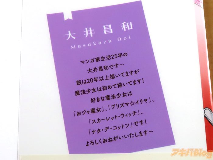 カバー折り返しで『飯は20年以上描いてますが魔法少女は初めて描いてます!好きな魔法少女は「おジャ魔女」、「プリズマ☆イリヤ」、「スカーレット・ウィッチ」、「ナタ・デ・コットン」です!』などを書かれている。