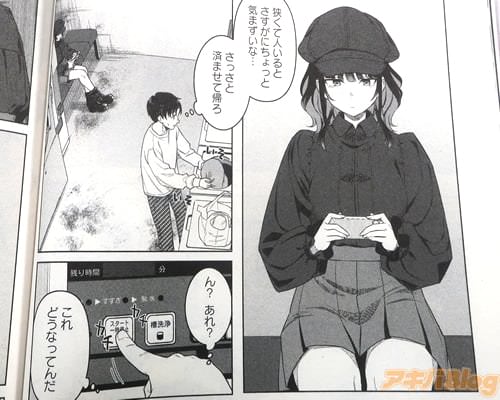 「(狭くて人いると、さすがにちょっと気まずいな…さっさと済ませて帰ろ)」