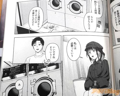 なお、「今夜コインランドリーで逢いましょう」1巻【AA】の感想には、まつださん『夜のコインランドリーでの、店舗を出たら忘れてるだろう駄話コメディ。それを楽しみにしているかのような