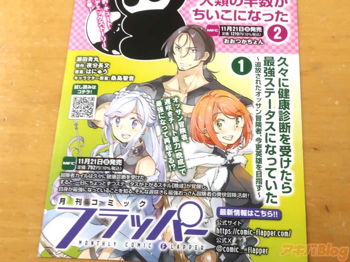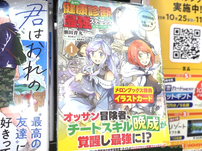 夜分長文的小説を瀬田青丸作画的漫画版「久々に健康診断を受けたら最強ステータスになっていた」第1卷【AA】が21日に公式発売日を迎えた。折込チラシは『遅咲きチート能力【晩成】!?』、オビは『気づけば最強になっていた中年冒険者のワンスアゲイン冒険ファンタジー!』。