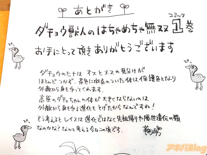 あとがきでは『高原のダチョちゃんの体が大きくならないのは、外敵から身を守る進化をとげたからなんですね!そう考えると、レイスは進化ではなく先祖返りや隔世遺伝の類なのかな?』などを書かれている。