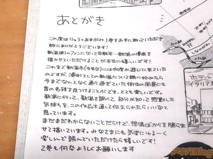 あとがきで『新潟(県)のファンになって早数年…新潟の漫画を描かせていただけることが本当に嬉しいです!これまで新潟市(中央区)には何度か遊びに来ていたのですが、湊町としての新潟について調べ始めたら、今までなんとなく通り過ぎていた街中の風景にも昔の名残を見つけることができ、とても楽しいです。新潟に行って、新潟を調べて自分が知って感動した気持ちを、この作品を通して伝えられたらいいなと思っています』などを書かれている。