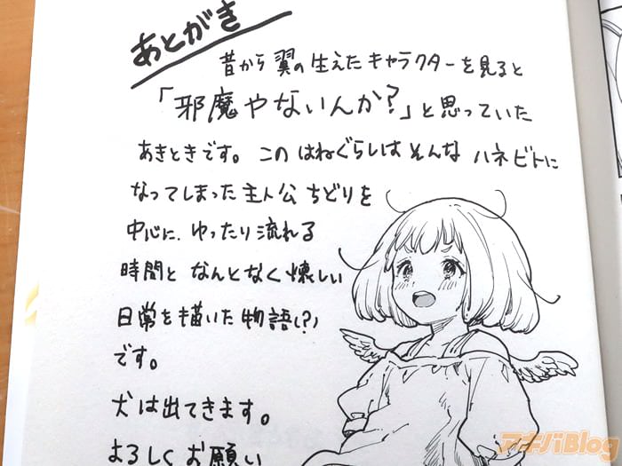 あとがきで『昔から翼の生えたキャラクターを見ると「邪魔やないんか?」と思っていた。このはねぐらしはそんなハネビトになってしまった主人公ちどりを中心に、ゆったり流れる時間と、なんとなく懐しい日常を描いた物語(?)です』などを書かれている。