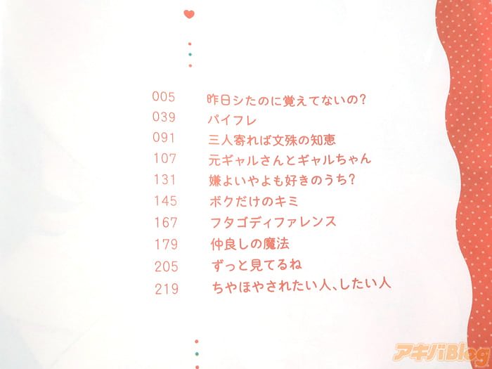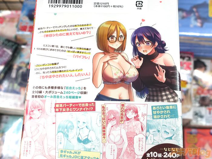 裏表紙は『婚活パーティーで出会った年下女子とワンナイト!?/今ギャルJKが元ギャルJDに猛アタック★/憧れの先輩が私のおっぱいに興味津々♥/あざとい後輩に甘やかされ溶かされて…』だった。婚活パーティーでマッチングしたのは年下の女の子!?しかもそのままホテルでシたらしいけど、覚えてなくて…「昨日シたのに覚えてないの?」。ミスコン第1位、誰にでも優しい大学の先輩が粗相のお詫びに求めてきたのは“おっぱい揉ませて”!?「パイフレ」。多種多様な「百合えっち」を全10編・大ボリューム240ページ収録!著者初のオール百合えっち短編集♥ 裏表紙