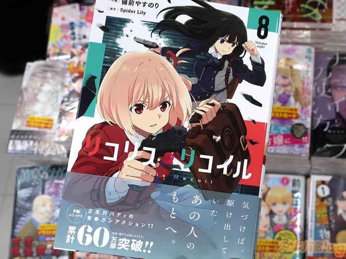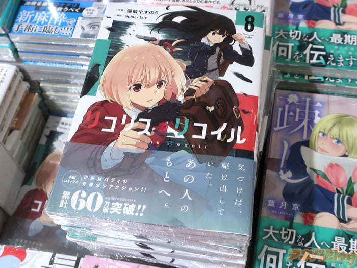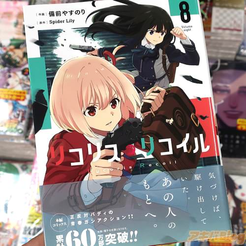 同名TVアニメを備前やすのり作画的漫画版「リコリス・リコイル」8巻【AA】于22日发售。オビ謳い文句は『正反対バディ的青春ガンアクション!』、コミックス情報は『ミカと吉松の約束を知った千束のもとに、囚われた吉松の映像が届いた』。
