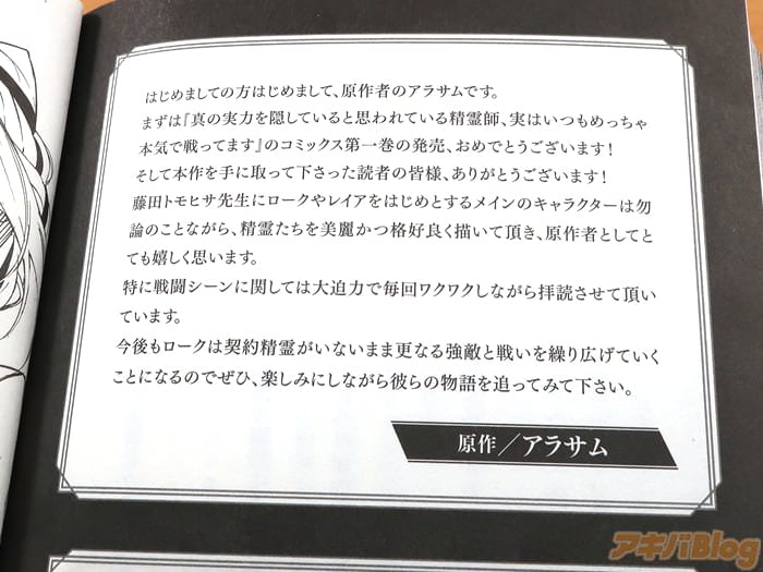 後書きで『藤田トモヒサ先生にロークやレイアをはじめとするメインのキャラクターは勿論のことながら、精霊たちを美麗かつ格好良く描いて頂き、原作者としてとても嬉しく思います。特に戦闘シーンに関しては大迫力で毎回ワクワクしながら拝読させて頂いています。今後もロークは契約精霊がいないまま更なる強敵と戦いを繰り広げていくことになるのでぜひ、楽しみにしながら彼らの物語を追ってみて下さい』、漫画:藤田トモヒサ氏は