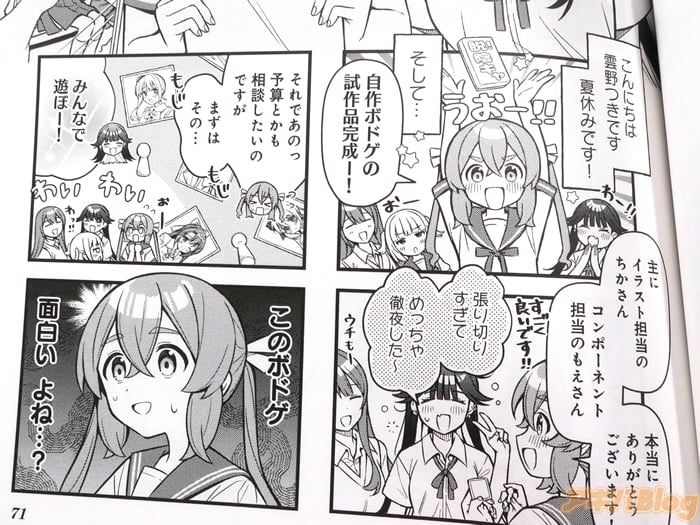 なお、「きみとボドゲが作りたい!」1巻【AA】の作者:赤城ナツイチ氏はカバー折り返しで『僕もギャルとボドゲがしたいです』、あとがきでは『大学時代に鍋とボドゲばかりしていたらこのような本が出来上がりました。マジか。~この作品を通じて少しでもボドゲや自作ボドゲに興味をもってもらえたら嬉しいです。Let'sモノづくり!』などを書かれている。