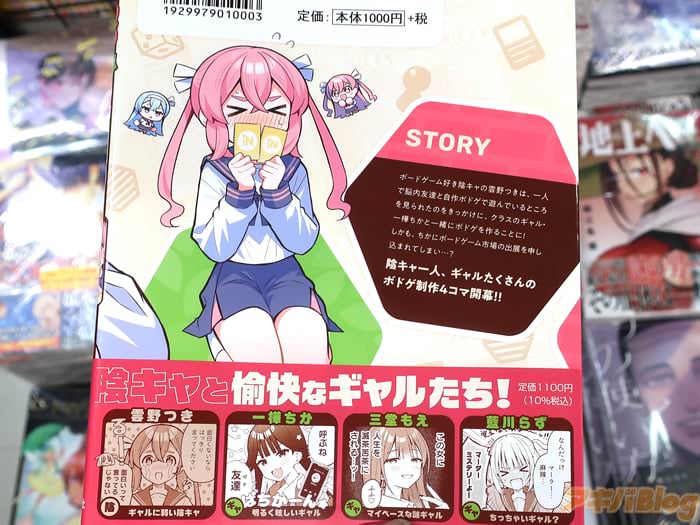 裏表紙は『陰キャと愉快なギャルたち!』、『陰キャ一人、ギャルたくさんのボドゲ制作4コマ開幕!』になってた。