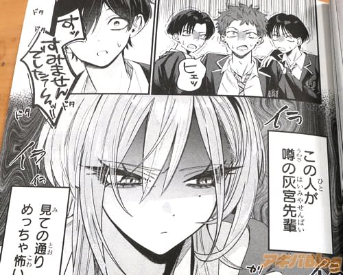『灰宮先輩は怖くてかわいい』は、コミックナタリーによると『弱気な性格からかいつも保健室の掃除を押し付けられている保健委員の男子高校生・黒瀬。しかも保健室には、校内で怖いと恐れられている先輩・灰宮先輩がいつも居座っている。バチバチのピアスに灰色のウルフヘアー、威圧感のある関西弁で周囲を威嚇する灰宮先輩。しかしなぜか黒瀬にだけは優しくて……』というお話。