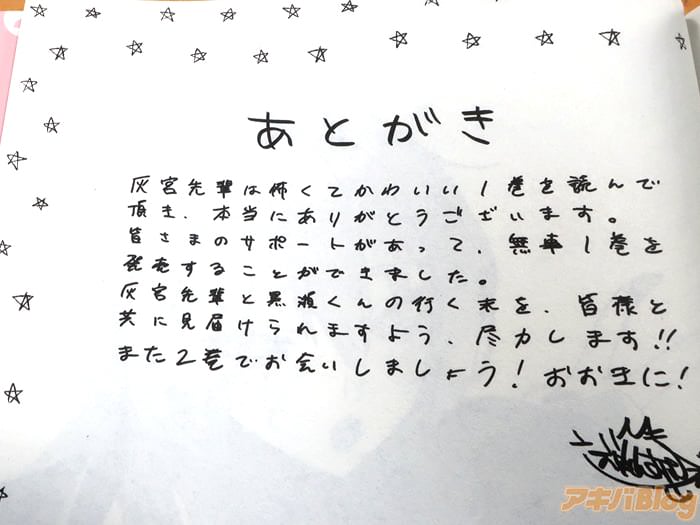 後書きで『皆さまのサポートがあって、無事1巻を発売することができました。灰宮先輩と黒瀬くんの行く末を、皆様と共に見届けられますよう、尽力します!また2巻でお会いしましょう!』、