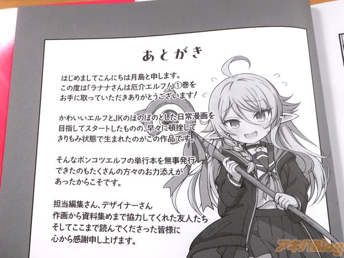 あとがきで『かわいいエルフとJKのほのぼのとした日常漫画を目指してスタートしたものの、早々に頓挫してきりもみ状態で生まれたのがこの作品です』、『2巻でもラナナさんの追放ライフを楽しんでいただけるよう精一杯努めてまいりますので、これからもどうぞよろしくお願いします!』などを書かれている。
