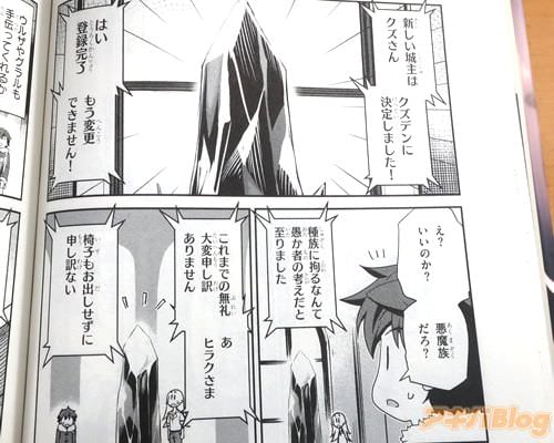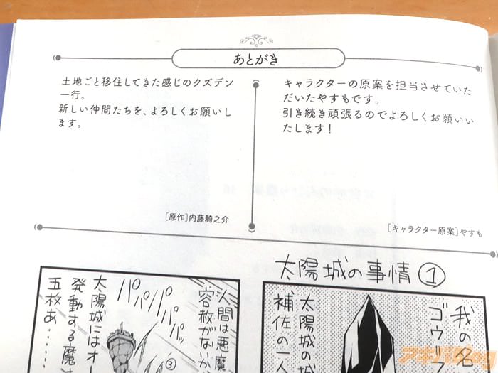 あとがきで『土地ごと移住してきた感じのクズデン一行。新しい仲間たちを、よろしくお願いします』を、作画:剣康之氏は
