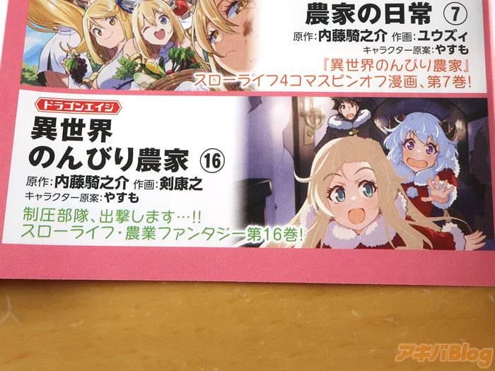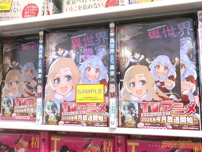 内藤騎之介氏の小説を剣康之氏がコミカライズされ、ドラゴンエイジで連載中の「異世界のんびり農家」16巻【AA】(キャラクター原案:やすも氏)が、アキバではもう出てる(公式発売日は9日)。