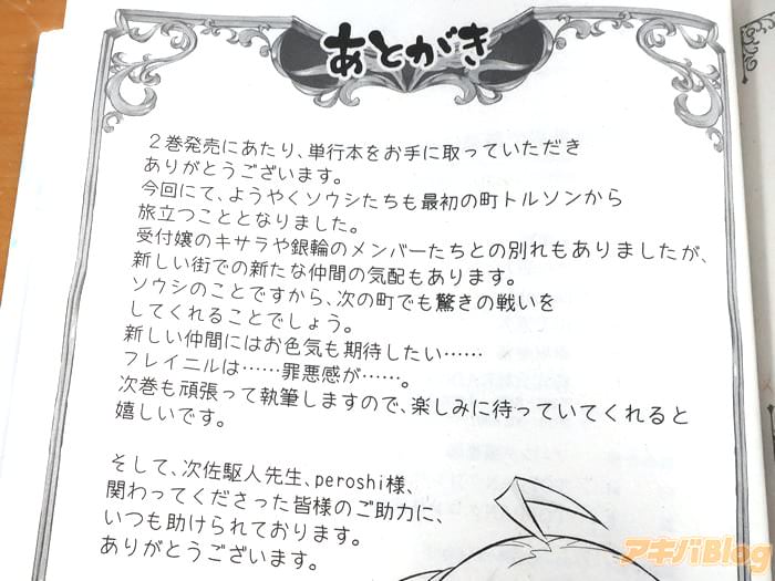 後書きで『今回にて、ようやくソウシたちも最初の町トルソンから旅立つこととなりました。ソウシのことですから、次の町でも驚きの戦いをしてくれることでしょう』などを書かれている。