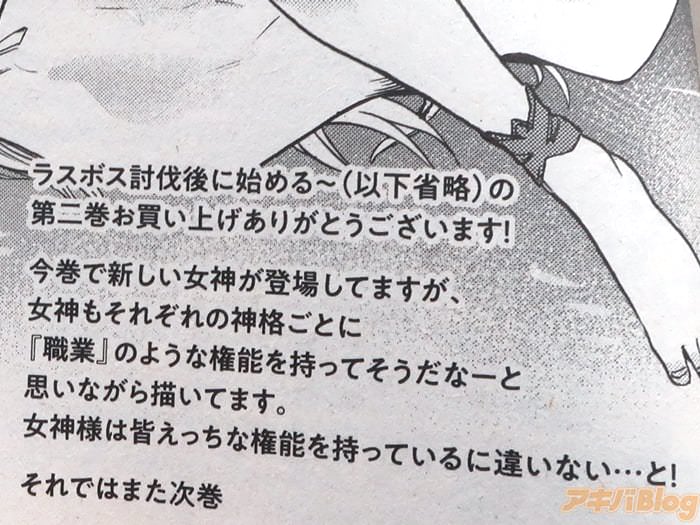 あとがきで、漫画:鬼麻正明氏は『今巻で新しい女神が登場していますが、女神もそれぞれの神格ごとに「職業」のような権能を持ってそうだなーと思いながら描いてます。女神様は皆えっちな権能を持っているに違いない…と!』などを書かれている。