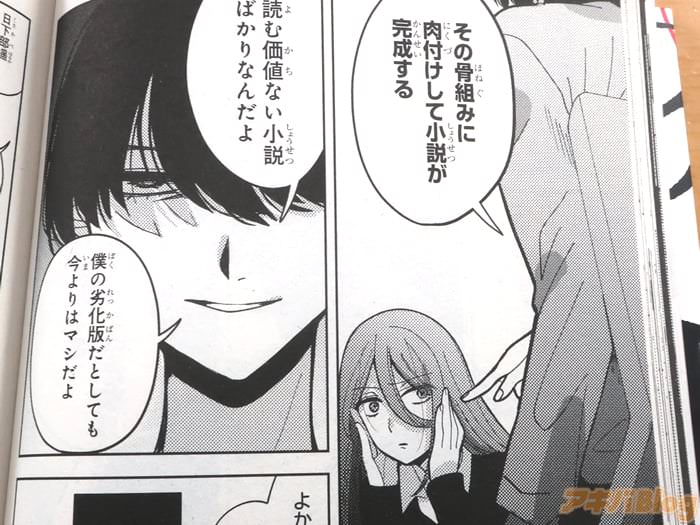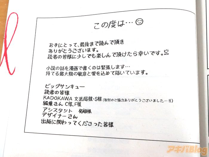 あとがきで『小説の話を漫画で書くのは緊張します…持てる最大限の敬意と愛を込めて描いています』、カバー折り返しでは『最近読んだ本は「PRIZE」です』などを書かれている。