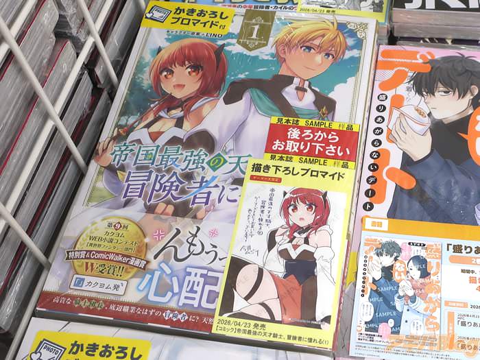 蒼井美紗氏のライトノベルを、今井ムジイ氏がコミカライズされ、カドコミ内・コミックフラッパーで連載されている「帝国最強の天才騎士、冒険者に憧れる」1巻【AA】(キャラクター原案:LINO氏)が、アキバでは21日に発売になった。