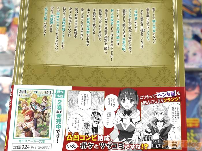 裏表紙は『凸凹コンビ結成、いえ、ボケとツッコミですね!?』、『はりきってヘンな服を選んでしまうフランツ!』、『若くして騎士団長となった剣と魔法の天才・フランツ。しかし彼が真に憧れていたのは“冒険者”だった!フランツが先の戦争で武功を立て、褒美として願ったのは長期休暇。かくして帝国最強の騎士は、新人冒険者として世界を巡ることに!本人は冒険者稼業を全力で楽しんでいるだけなのに、気づけば国中の問題を次々と解決していて!? のちに英雄譚となる“気まま旅”が始まる!』だった。