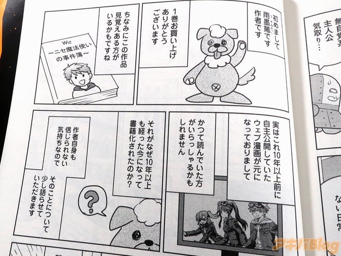 後書き漫画で『そもそもこの「Wiz~ニセ魔法使いの事件簿~」という作品、「これでダメなら漫画家をあきらめよう」という気持ちで、12年くらい前に商業化を目指して描き始めました。ある投稿サイトの読者レースで見事優勝!ですがその後は担当編集がつくこともなく…。~遂に夢をあきらめ5年ほど前に創作活動から卒業しました』、『そんなある日、とあるDMが。現役時代には届かなかった商業連載――そのお誘いのDMがなぜか10年経った今届いたのでした』などを描かれている。