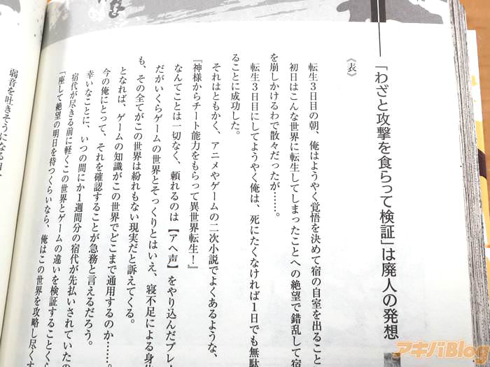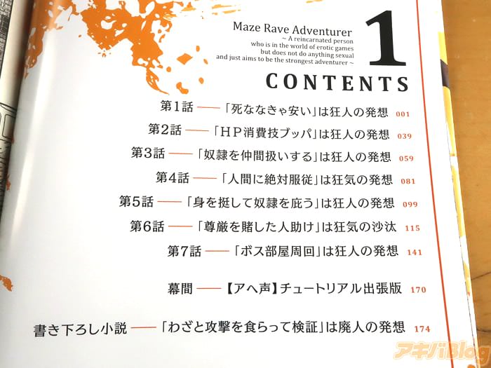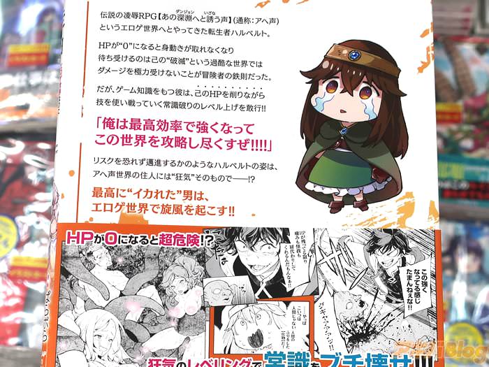 裏表紙は『伝説の凌辱RPG【あの深淵(ダンジョン)へと誘う声】(通称:アヘ声)というエロゲ世界へとやってきた転生者ハルベルト。HPが“0”になると身動きが取れなくなり、待ち受けるのは己の“破滅”という過酷な世界では、ダメージを極力受けないことが冒険者の鉄則だった。だが、ゲーム知識を持つ彼は、己のHPを削りながら技を使い戦っていく常識破りのレベル上げを敢行!リスクを恐れず邁進するかのようなハルベルトの姿は、アヘ声世界の住人には“狂気”そのもので――!?』などだった。