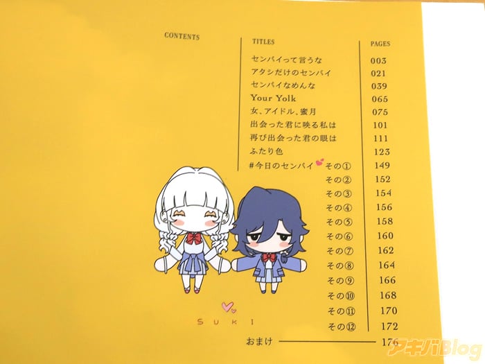 「センパイって言うな」【AA】には、KADOKAWAや一迅社のアンソロジーコミックから、表題作「センパイって言うな」や、「アタシだけのセンパイ」、「センパイなめんな」、「Your Yolk」、「女、アイドル、蜜月」、「出会った君に映る私は」、「再び出会った君の眼は」、「ふたり色」の計8編と、きぃやん氏が自身のSNSに投稿された「#今日のセンパイ♥」その1~その12のほか、「おまけ」を収録(