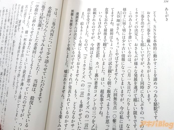 あとがきでは『「このラノ」のランクイン、コミカライズの決定と、おもさぶが様々な発展を遂げて嬉しい限りです。三巻では和気藹々とした水着回にしようかと思っていたのですが、ついうっかりとこのような話へと変化してしまいました』などを書かれている。