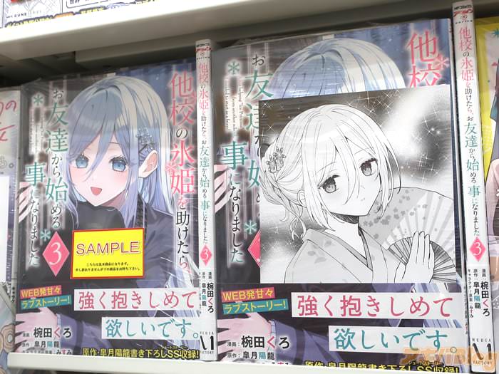 皐月陽龍氏のライトノベルを、椀田くろ氏がコミカライズされている「他校の氷姫を助けたら、お友達から始める事になりました」3巻【AA】がアキバでは26日に発売になった。裏表紙が『蒼太の中で、凪に対する自身の想いが溢れ』、オビは『強く抱きしめて欲しいです』、『WEB発甘々ラブストーリー!』だった。