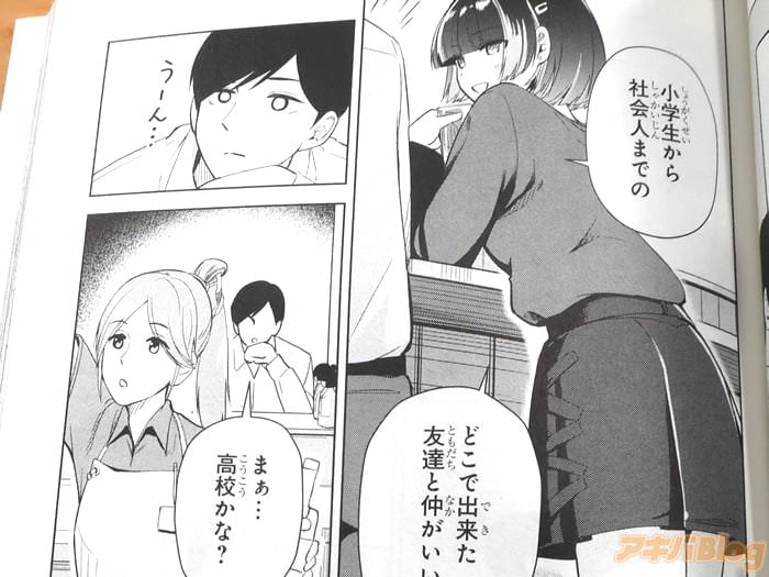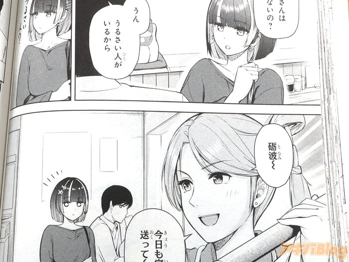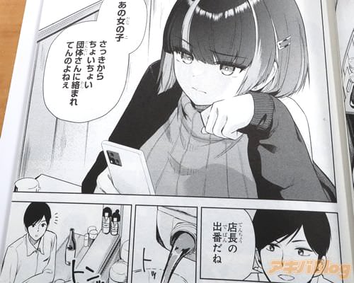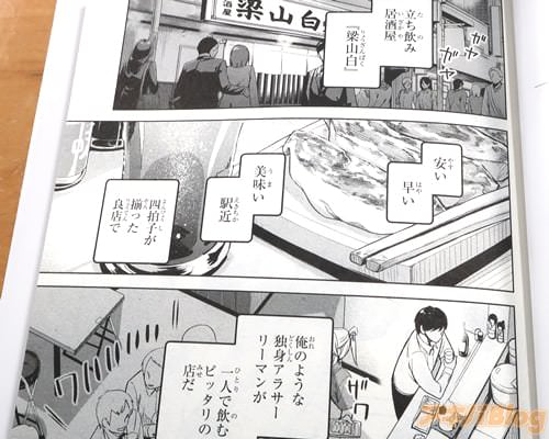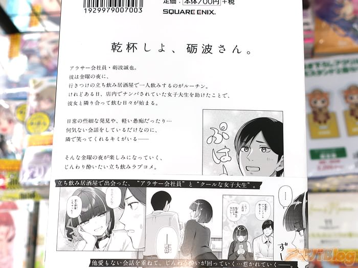 裏表紙が『乾杯しよ、砺波さん』、『立ち飲み居酒屋で出会った、“アラサー会社員”と“クールな女子大生”』、オビ謳い文句は『仕事終わりにクールなあの子と並んで乾杯――』、『じんわりチルい立ち飲みラブコメ』だった。