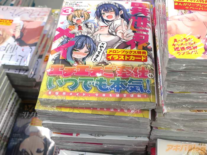 立石立飲氏の小説を、ウニドン¥120氏がコミカライズされている「異世界メイドがやってきた」3巻【AA】がアキバではもう出てる。裏表紙が『エチエチな仲間が増えて、タカヒロの異世界ライフは爆上がりの気配!?』、オビ謳い文句は『異世界メイド、今日も通常運転!』などだった。