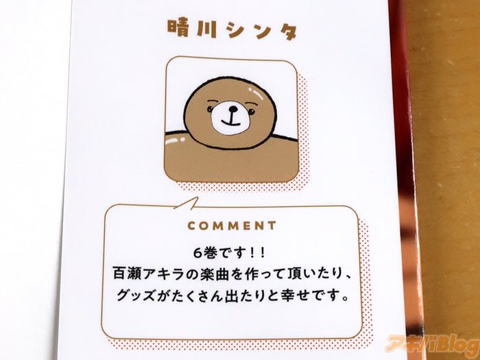 カバー折り返しで作者:晴川シンタ氏は『6巻です!百瀬アキラの楽曲を作って頂いたり、グッズがたくさん出たりと幸せです』などを書かれている。