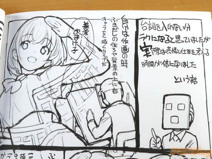 あとがき漫画で『自分は作画の時、ふきだしの後ろや背景の上にもキャラを描くタイプだ。「台詞の無い漫画」の状態にせりふを入れる事で完成となる…のだが…それは自分で選んだものなのだが…正解をひとつに絞った結果、答えを決めずにいた状態の方が面白いのかもしれないと思うようになった』などを描かれている。