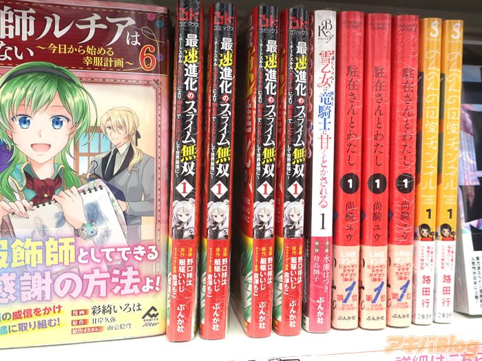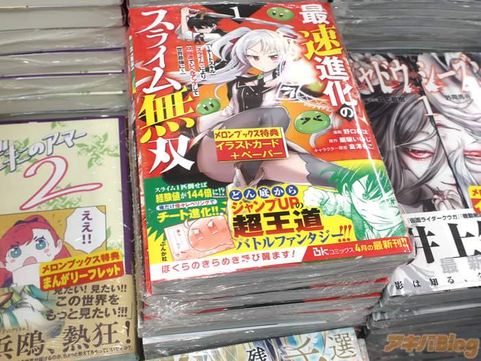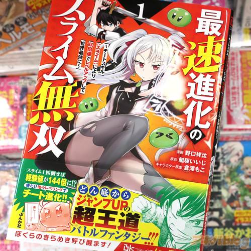 艇駆いいじ的小説、野口祥汰作画的漫画版「最速進化のスライム無双」第1卷【AA】于秋叶原2日发售。コミックス情報は『チート級スキルで最強への道を駆けあがっていく!』、オビは『スライム1匹倒せば経験値が144倍に!?俺だけ倍々レベリングでチート進化!』などだった。