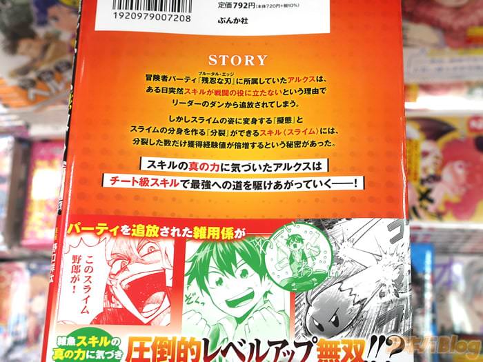 裏表紙は『パーティを追放された雑用係が――雑魚スキルの真の力に気づき、圧倒的レベルアップ無双!?』で、オビ謳い文句は『どん底からジャンプUPの超王道バトルファンタジー!』、『スライム1匹倒せば経験値が144倍に!?俺だけ倍々レベリングでチート進化!』などだった。