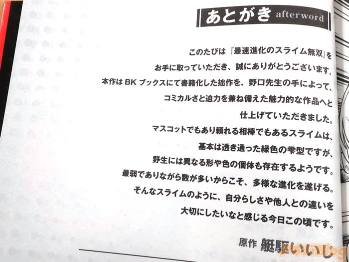 あとがきで『最弱でありながら数が多いからこそ、多様な進化を遂げる。そんなスライムのように、自分らしざや他人との違いを大切にしたいなと感じる今日この頃です』、同じく