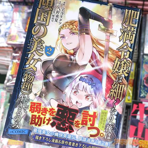 八針来夏的小説を、宇斗リクツ作画的漫画版「肥満令嬢は細くなり、後は傾国の美女(物理)として生きるのみ@COMIC」2巻【AA】がアキバではもう出てる。裏表紙が『カリスマの化物、現世に降臨!?』、コミックス情報は『弱きを助け、悪を討つ。最強美女の痛快英雄伝!』などになってる。