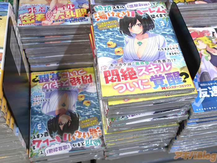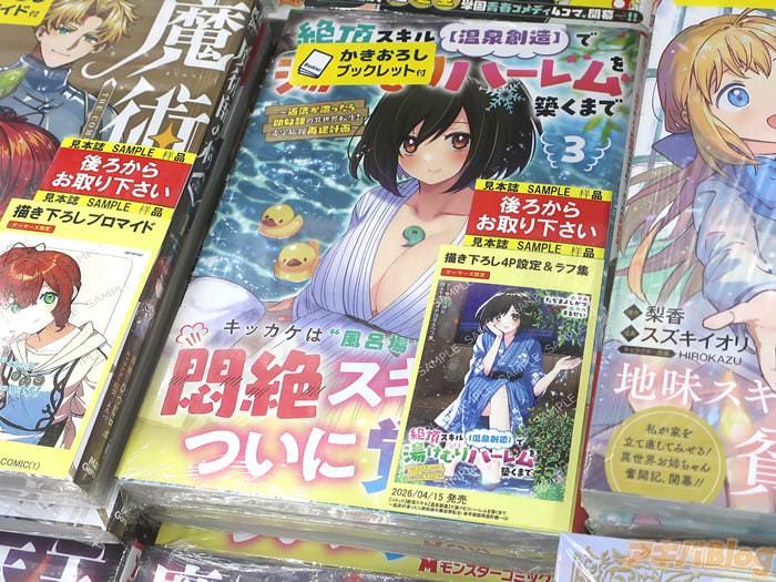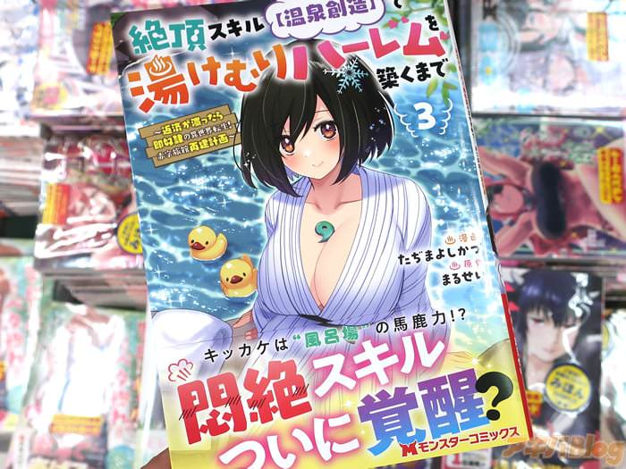 原作:まるせい氏&漫画:たぢまよしかづ氏が、マンガがうがうで連載されているコミックス「絶頂スキル【温泉創造】で湯けむりハーレムを築くまで~返済が滞ったら即奴隷の異世界転生!赤字旅館再建計画~」3巻【AA】が、アキバではもう出てる。