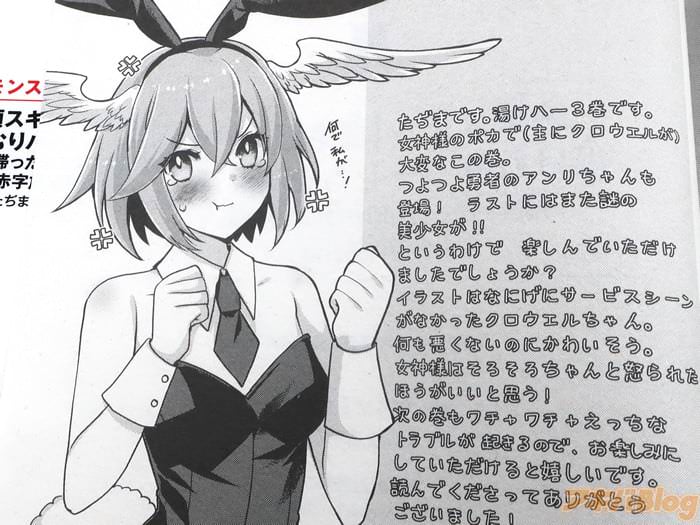 あとがきで『湯けハー3巻です。女神様のポカで(主にクロウエルが)大変なこの巻。つよつよ勇者のアンリちゃんも登場!ラストにはまた謎の美少女が!~次の巻もワチャワチャえっちなトラブルが起きるので、お楽しみにしていただけると嬉しいです』などを書かれている。